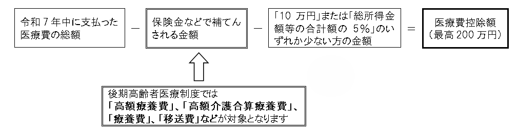医療費控除の対象となる金額は、「令和7年中に支払った医療費の総額」-『保険料などで補填される金額』-「「10万円」または「総所得金額等の合計額の5%」のいずれか低い方」=【医療費控除額(最高200万円)】で求められます。