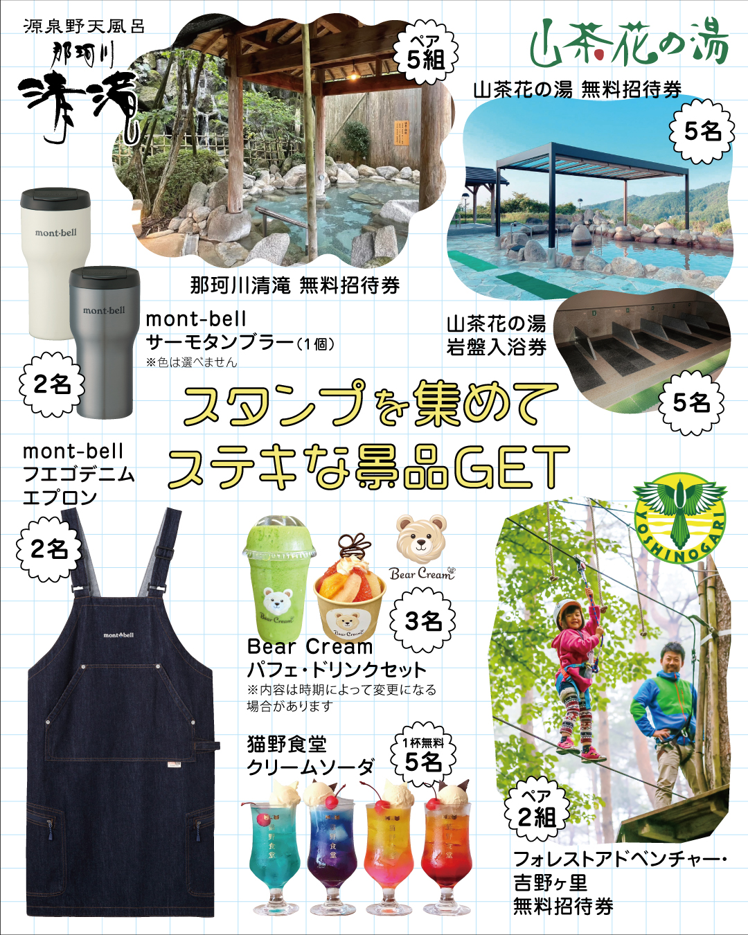 スタンプを集めて応募すると、抽選でひがしせふり温泉山茶花の湯の無料招待券や岩盤入浴券、mont-bellのフエゴデニムエプロンやサーモタンブラーなどが当たります。