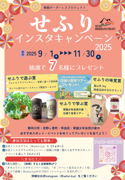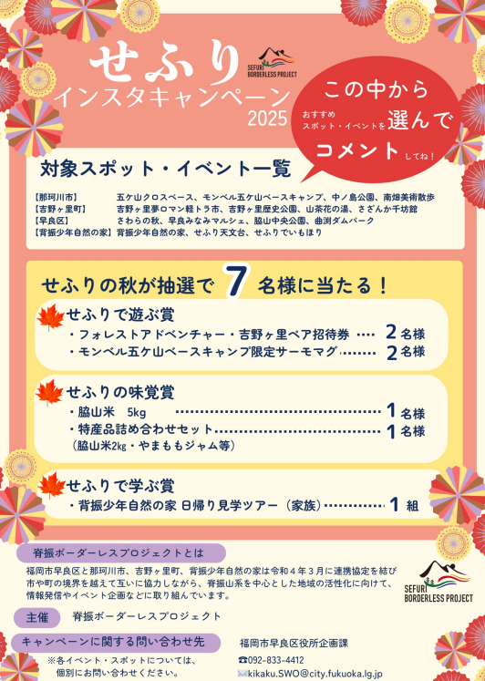 「脊振ボーダーレスプロジェクト」の共同キャンペーンとして、「せふりインスタキャンペーン2025」を開催します。吉野ヶ里町・福岡市早良区・那珂川市・背振少年自然の家の対象のイベント・スポットをコメントすると、抽選で7名様に脊振の魅力あふれるプレゼントが当たります!