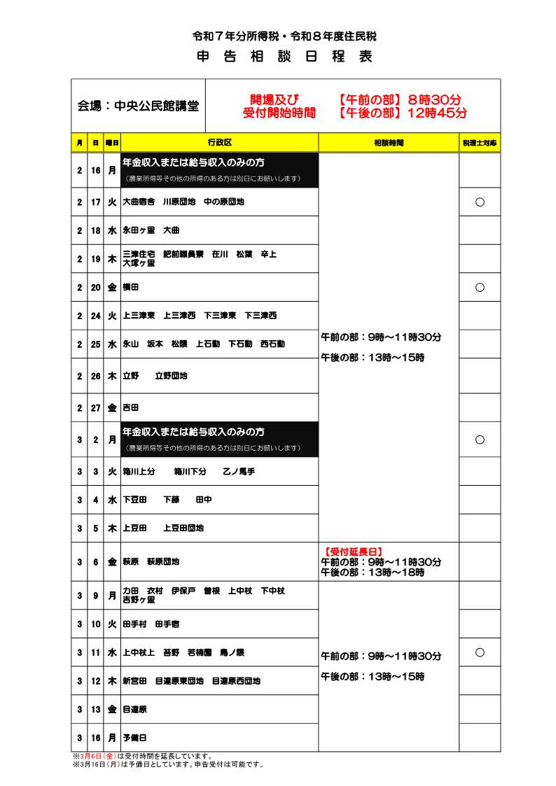 令和8年2月16日(月曜)から始まる「令和7年分所得税・令和8年度住民税の申告相談」の会場については、同年3月16日(月曜)までの全日程において「中央公民館」(三田川庁舎西側)の1箇所だけでの相談受付となります。