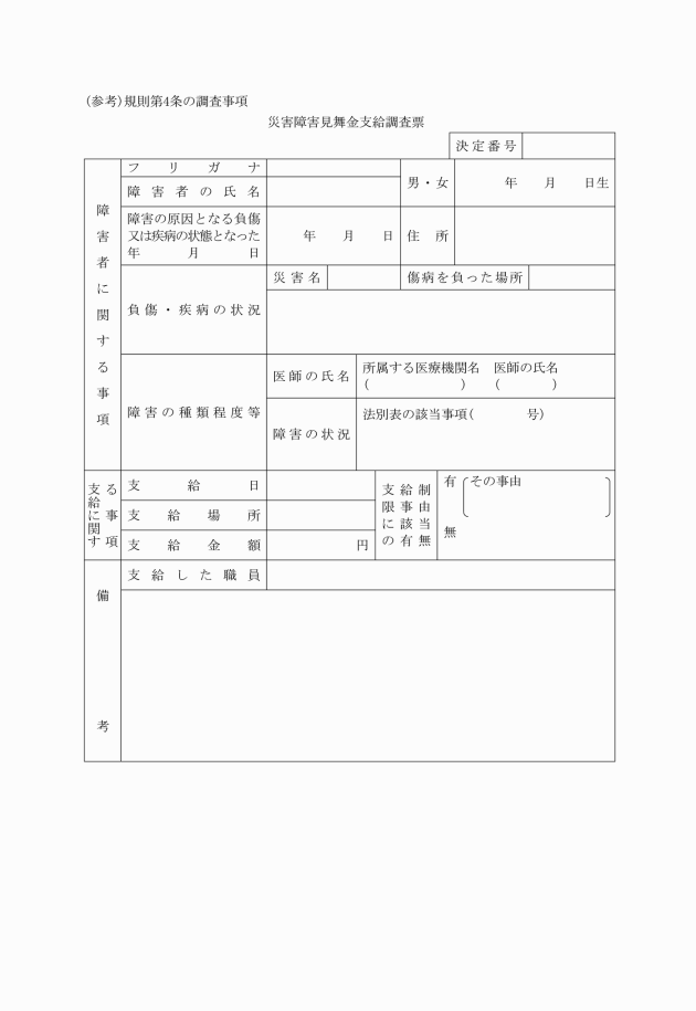 第4条 町長は、条例第9条の規定により災害障害見舞金を支給するときは、次に掲げる事項の調査を行った上、災害障害見舞金の支給を行うものとする。