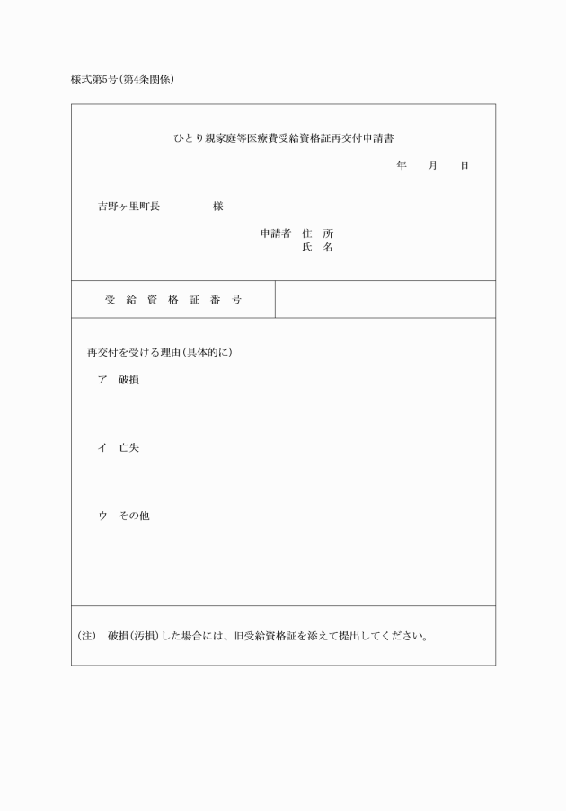第4条 受給資格者は、受給資格証を破損し、又は亡失したときは、町長にひとり親家庭等医療費受給資格証再交付申請書(様式第5号)により再交付を申請しなければならない。