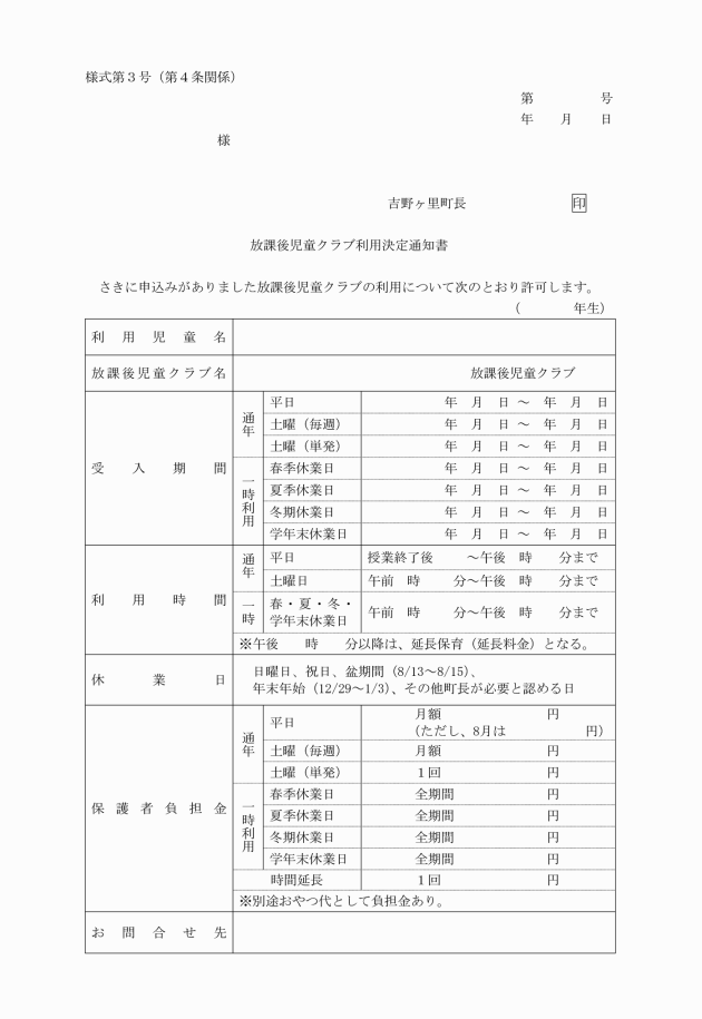 第3条 児童クラブを利用しようとする児童の保護者(以下「保護者」という。)は、あらかじめ放課後児童クラブ利用申込書兼児童台帳(様式第1号。以下「利用申込書兼児童台帳」という。)に必要書類を添えて町長に提出しなければならない。